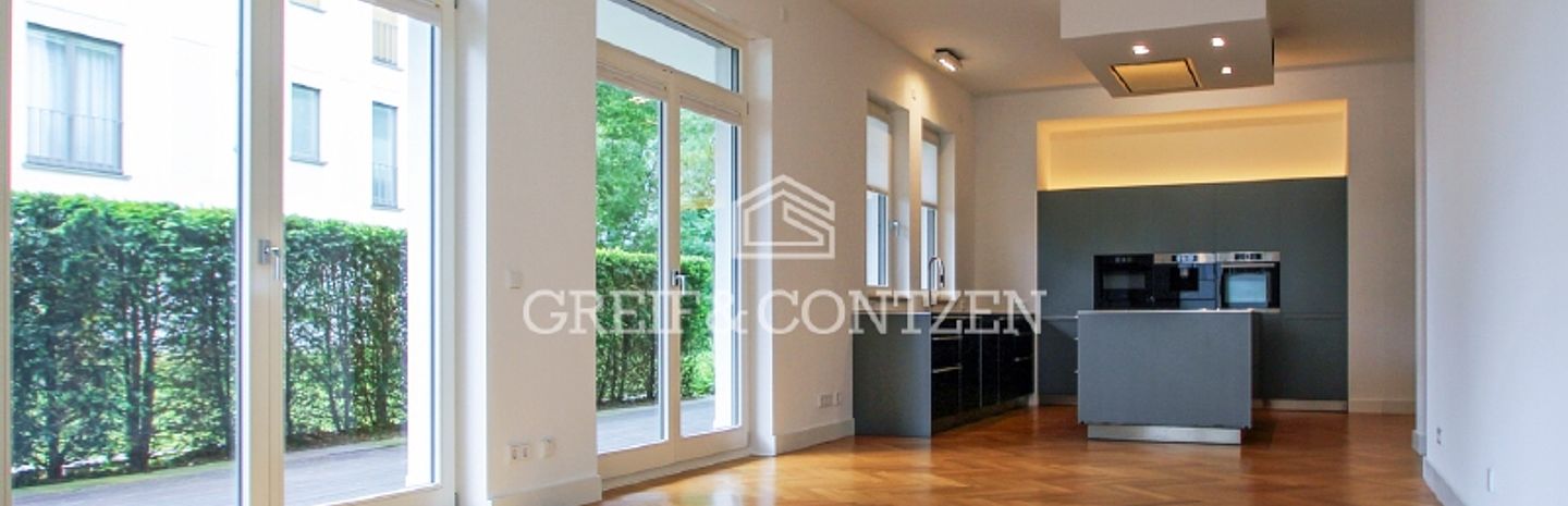 Der außerordentlich großzügige Empfangsbereich mit dekorativer Lichtvoute bildet das Herzstück dieser wunderschönen barrierefreien 3-Zimmer-Wohnung. Dem lichtdurchfluteten Wohn-/Essbereich mit offener Küche ist eine ca. 46 m² große Terrasse (teils überdacht) vorgelagert, die einen herrlichen Blick in die liebevoll angelegte Grünanlage freigibt. Die in der Wohnung eingebaute hochwertige Küche der Marke bulthaup inkl. Elektrogeräten ist Teil des Angebots und wird dem Mieter zur Nutzung überlassen.