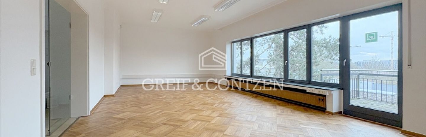 Die Bürofläche befindet sich in einem gepflegten Gebäude, erstreckt sich über zwei Etagen und wird durch einen eigenen Hauseingang erschlossen. Sie zeichnet sich durch helle Büroräume mit großzügigen Fensterflächen aus und bietet zudem eine weitläufige Terrasse. Zusätzlich können zwei Außenstellplätze, bei Bedarf auch weitere, angemietet werden.