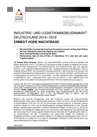 13. Februar 2019, Hamburg. Logistik- und Industrieimmobilien standen 2018 bei Investoren und Nutzern weiter hoch im Kurs – auch wenn es aufgrund des knappen Angebots im Vergleich zum Vorjahr insgesamt einen Rückgang des Transaktionsvolumens und Flächenumsatzes gab. Das zeigt der Industrie- und Logistikimmobilien-Marktbericht des Gewerbeimmobilienmakler-Netzwerks German Property Partners (GPP). Das Investment-Transaktionsvolumen in den deutschen Top-Industrie- und Logistikimmobilienregionen Hamburg, Berlin, Düsseldorf, Köln, Frankfurt, Stuttgart und München sank im vergangenen Jahr leicht um 5 % und erreichte – vor dem Hintergrund eines außergewöhnlichen Investmentjahres 2017 – gleichwohl immer noch starke 2,3 Mrd. €. In den Logistikmärkten von Hamburg, Berlin, Düsseldorf und insbesondere München nahm der Investmentumsatz sogar zu.